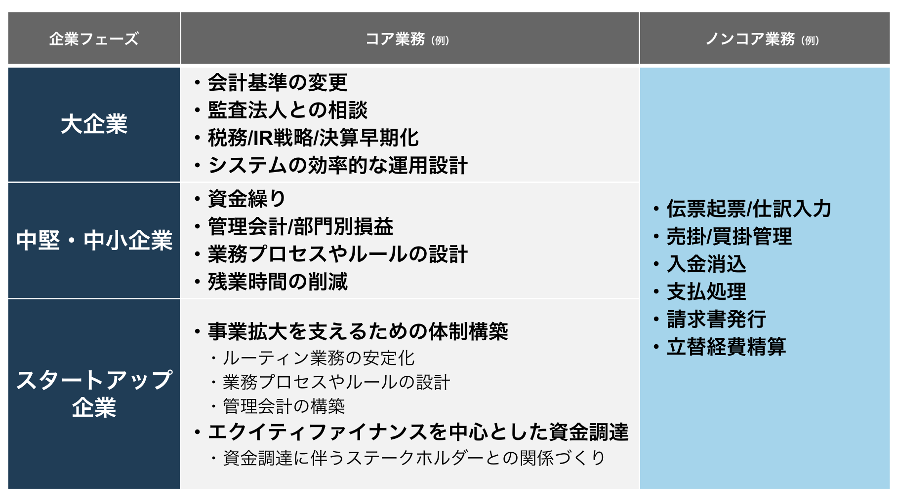 コア業務の具体的な内容は企業フェーズごとに異なりますが、ノンコア業務はどの企業でもあまり変わらず、伝票起票・仕訳入力・売掛/買掛管理・入金消込などがそれに当たります。一般的な経理部では、全体の業務のうちノンコア業務が占める割合の方が大きいと思いますが、多くの企業はコア業務の割合を増やしたいという理想をお持ちだと思います。そのためにはノンコア業務を削減することがファーストステップになるでしょう。