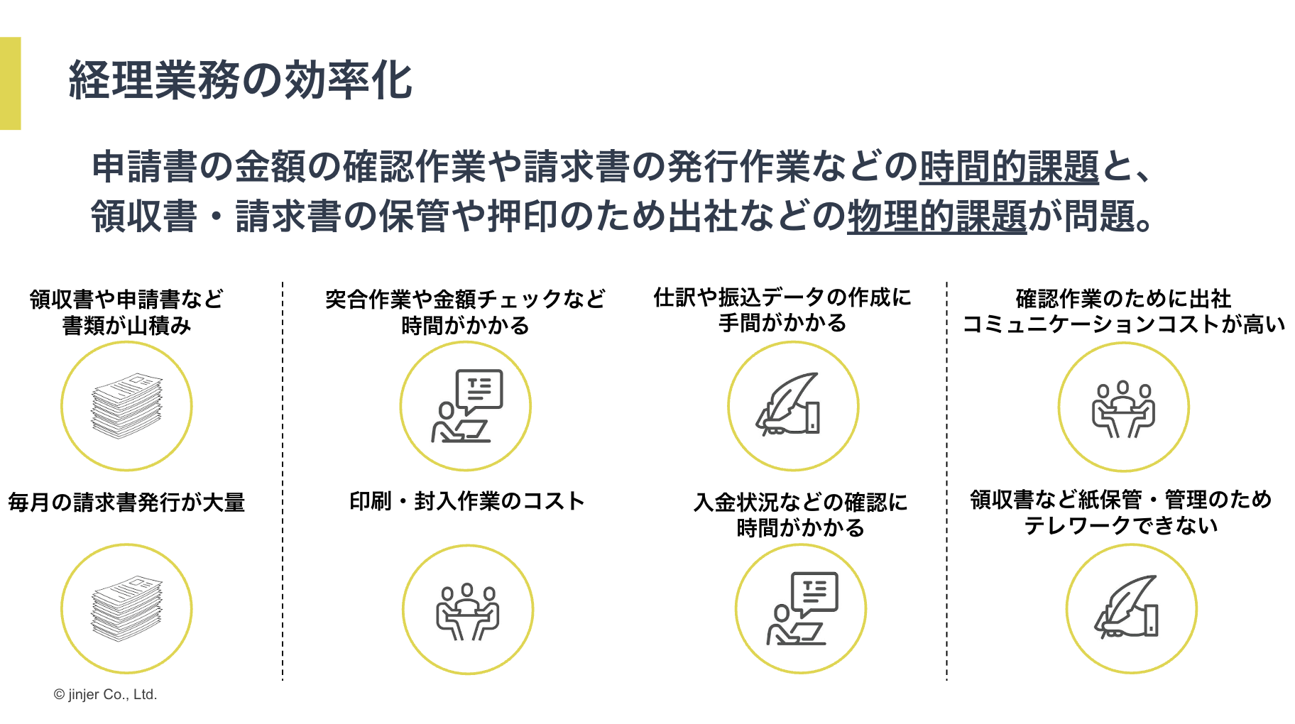 経理業務における課題としてよく伺うことに、「領収書や請求書の発行・保管、押印のために出社が必要でリモートワークができない」といった物理的課題があります。「申請書類のチェックや請求書の発行・郵送、仕訳や振込データの作成、入金確認や督促といった作業に時間がかかる」という時間的課題についてのお悩みも多々あります。