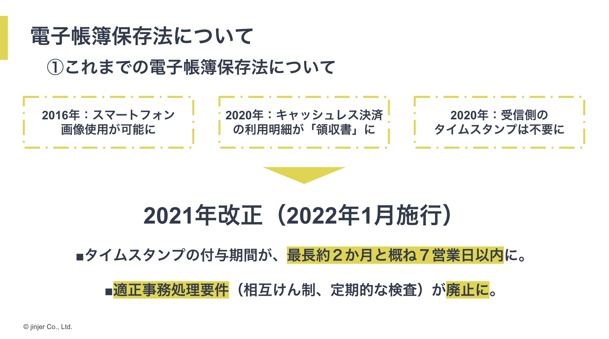 これ以降、複数回にわたって法律は改正され、2022年1月には「タイムスタンプの付与期間の延長と緩和」「適正事務処理要件の廃止」という大幅な改正が行われました。これにより、今後ペーパーレス化はさらに進むと期待されています。猶予期間は2023年12月末までとなっていますが、あまり時間的な余裕がないため、現在各企業が対応を進めている状況です。