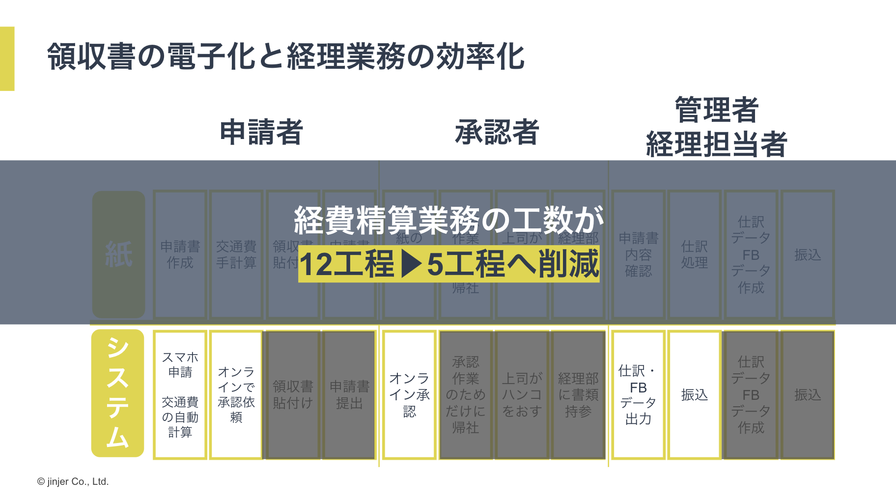 通常、経費精算業務には「申請者」「承認者」「管理者・経理担当者」の3者が関わっています。紙で経費精算を行う場合、まず申請者が書類を作り、交通費を計算し、領収書を添付して承認者に提出します。承認者は書類を確認し、出社してハンコを押し、経理部に渡します。そして経理部は書類の内容を確認し、仕訳処理を行い、データを会計システムに流し込んで振込を行います。ここまでに計12もの工程があると考えます。