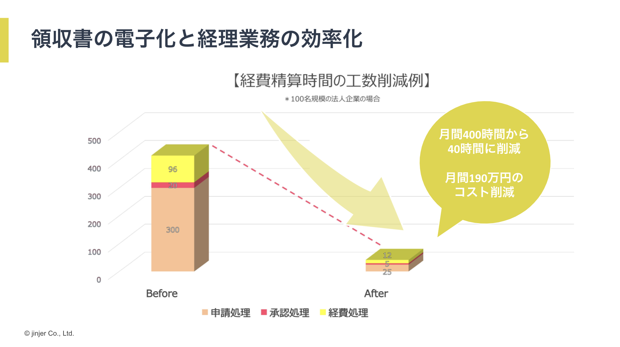 経費精算にかかっていた印刷代や人件費などのコストが大幅に削減できるほか、スマートフォンで申請や承認作業ができるためスキマ時間を有効活用できてコア業務により時間を割けるようになるといったメリットもあります。実際、jinjer経費精算を導入された100人規模の企業さまの場合、経費精算にかかる時間を月400時間から40時間にまで削減でき、月190万円のコスト削減を実現しました。