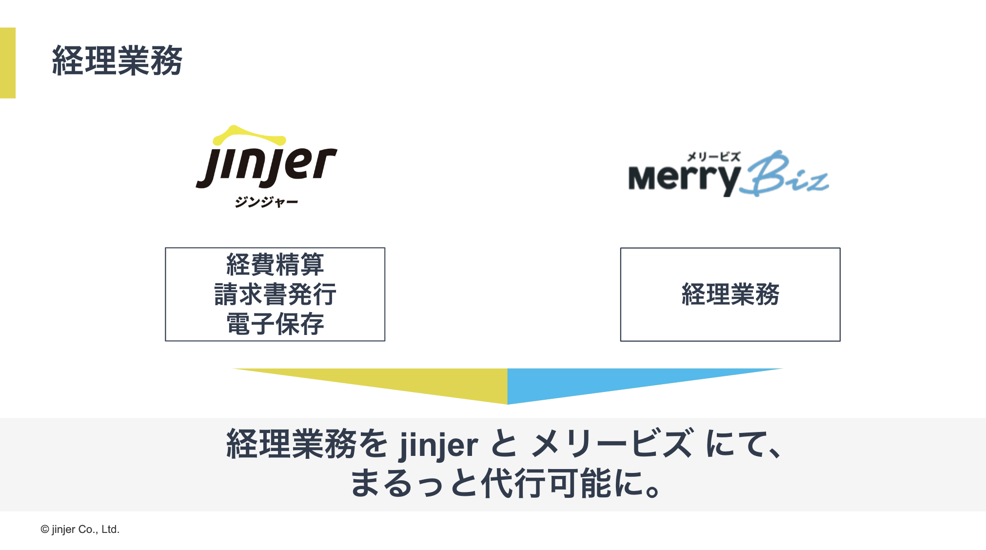 経費精算や請求書発行、電子データの保存をjinjerで進め、そのほかの経理業務全般をメリービズで代行といった活用方法があります。2つを掛け合わせて活用いただくことで、経理担当者のみなさんの業務をかなり減らすことができると考えています。