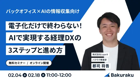 | 対象 | ✔経理業務効率化のシステム検討をする前に、業務フローや検討軸の整理を行いたい方 ✔AIを活用した具体的なシステム活用や経理業務の効率化事例を知りたい方 ✔請求書や領収書など書類の電子化をしてみたが、期待通りの効率化まで至らず打開策を考えたい方 |
