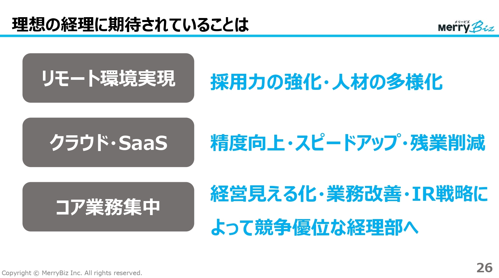 長谷:経理にとって理想的な状態とは、どのようなものでしょうか?弊社では大きく分けて次の3つの要素が必要だと考えています。