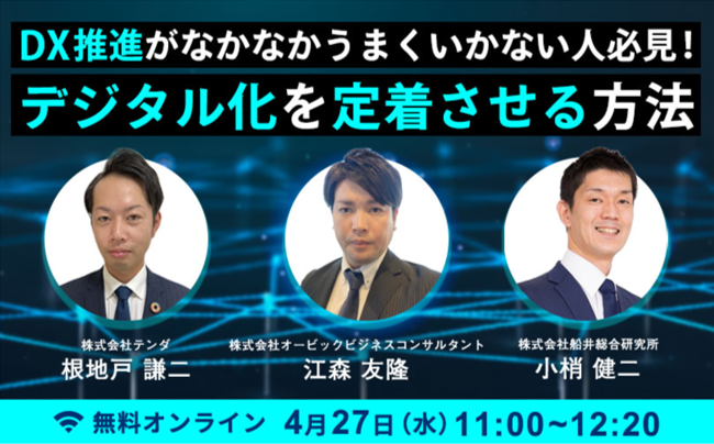 本セミナーでは、株式会社船井総合研究所や株式会社テンダをゲスト講師に、デジタルツールを定着させてDX化を実現するための方法が解説されます。