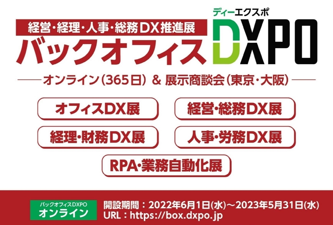 本イベントは、企業の管理部門向けの業務改革・生産性向上を支援するソリューション・サービスを一堂に集めた、オンラインとリアルのハイブリッド展示会です。経理・財務DX展や人事・労務DX展などの5つの展示会で構成されています。