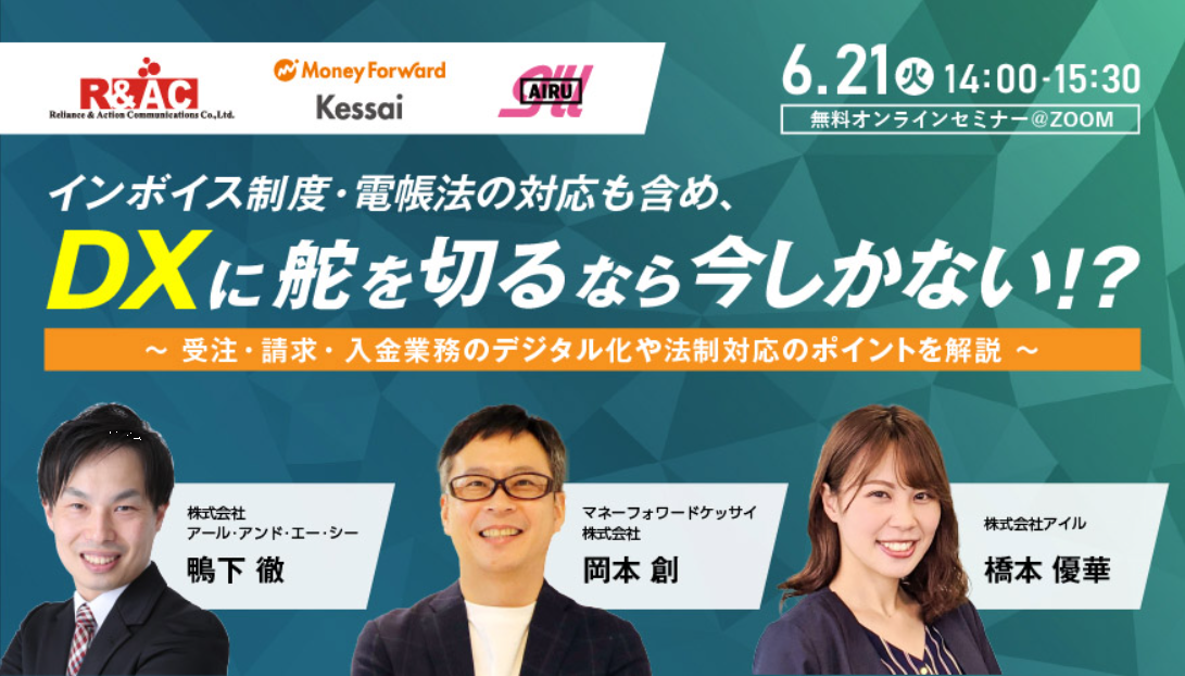 | 対象 | ✔バックオフィス業務の最新動向をキャッチしたい方 ✔受注業務・請求業務・入金消込に課題がある、テレワークの弊害となっている方 ✔中堅・中小企業でも取り組めるDXについて知りたい方 |