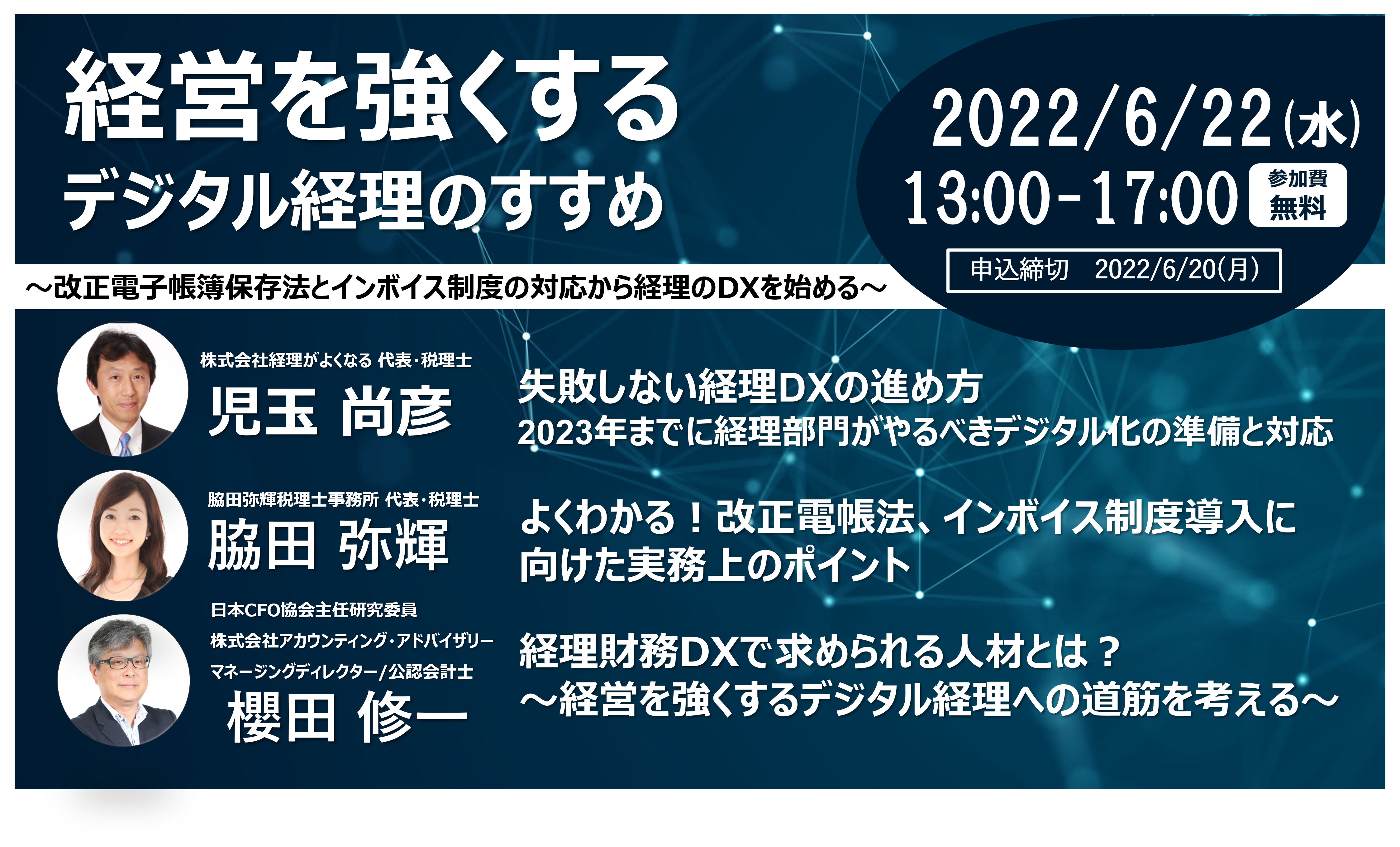 本イベントでは、「電子帳簿保存法」「インボイス制度」をはじめとした法改正対応、業務効率化に向けたDX導入の具体的な方法など、一歩先の「経理の働き方」を実現させるために必要な最新情報が解説されます。