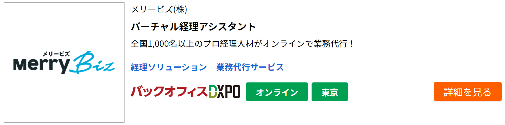日本最大級の商談型展⽰会事業・オンライン展⽰会事業を行っているブティックス株式会社による、365日開催のオンライン展示会です。本イベントは、企業の管理部門向けの業務改革・生産性向上を支援するソリューション・サービスを一堂に集め、企業のバックオフィスとDXソリューションを提供する企業とのビジネスマッチングに特化しています。メリービズも出展しているので、ぜひご覧ください。