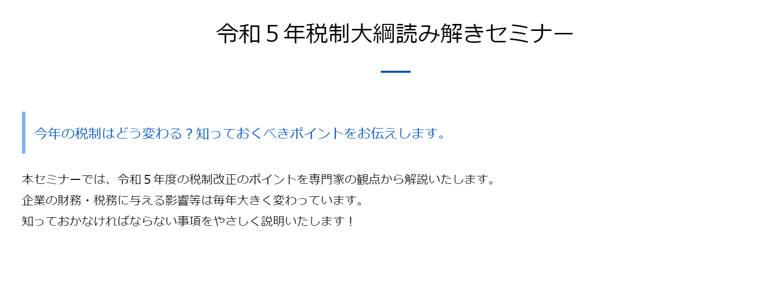 本イベントでは「令和5年度税制改正大綱」に基づく概要が解説されます。