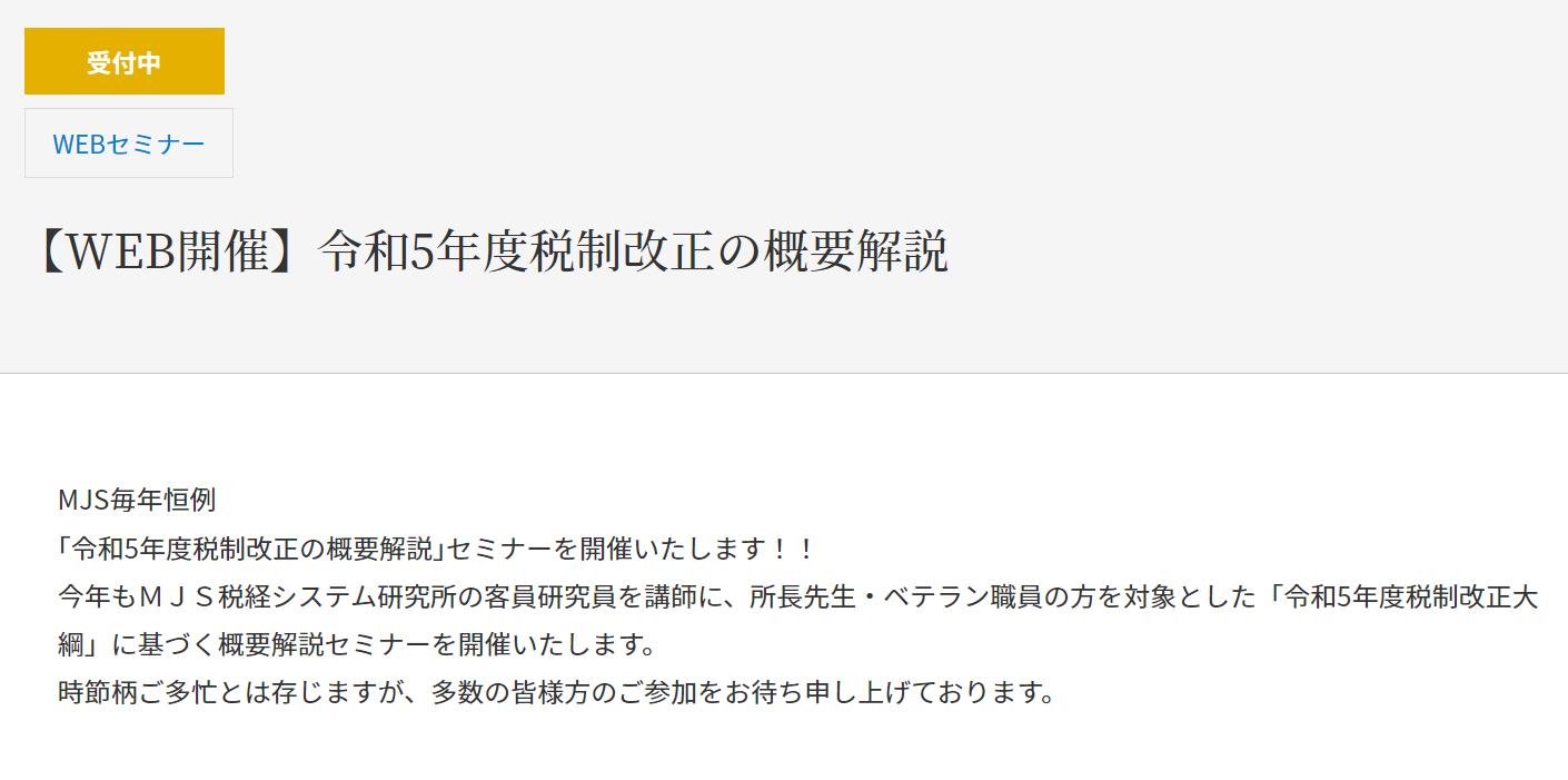 | 対象 | ✔令和5年税制改正の概要を知りたい方 ✔MJS税経システム研究所の客員研究員を講師からお話を聞きたい方 |