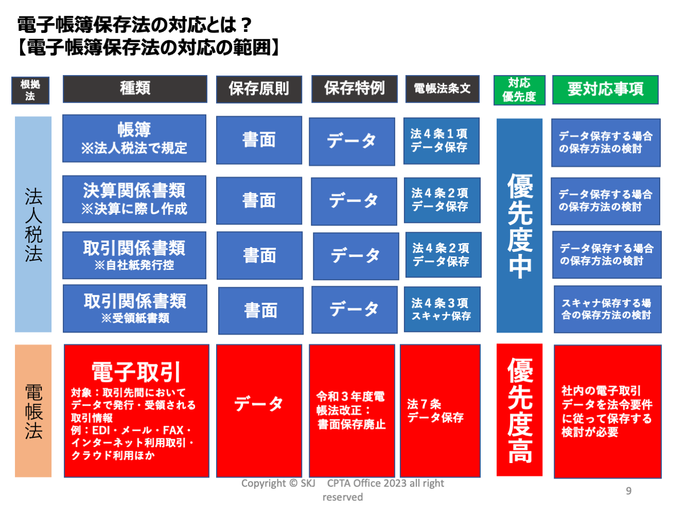 優先度別に対応範囲をまとめました。スライドをご覧ください。電子取引については、原則データで保存する必要があります。現時点(2023/01/25時点)では特例として出力書面による保存がある場合にはデータ保存は必須ではないですが、令和3年度改正以降は書面保存が廃止されますので今年中に対応しましょう。