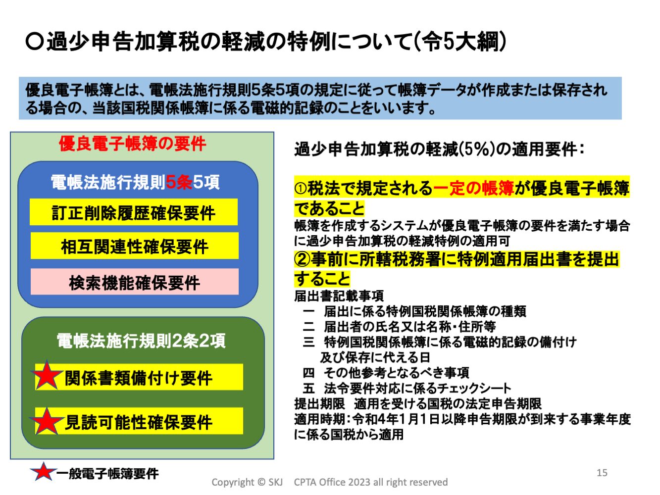 そこで今回の改正では、この優良電子帳簿の範囲が狭められました。前述の通り、国税庁には優良電子帳簿を使う事業者を増やしたい狙いもありますから、この利用を促進させるため過少申告加算税の特例適用要件を緩和した形になります。