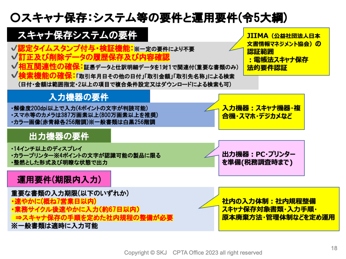 スキャナ保存にはデータを保存するためのシステムが必要ですが、そのシステムに求められる要件が緩和されました。JIIMA認証を受けている製品であればシステムの機能と要件を照らし合わせる必要はありませんので、認証済みの製品を利用しましょう。運用要件については、令和3年度改正で既に大きく緩和されています。このように真実性の確保を求める要件が緩和されたことで、書面で受領した取引書類のスキャナ保存が促進されると期待されています。