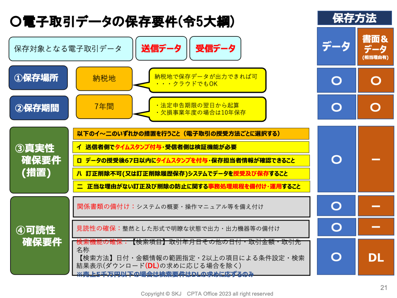 救済の最たる例とも言えます。事実、零細企業をはじめシステム対応が間に合っていない事業者も少なくありません。これまでとは異なり出力書面の保存だけでなくデータによる保存も求められていますが、タイムスタンプの付与や検索機能の確保といった要件は不要とされています。確かに多少の手間は増えますが、逃げ道を作ったという意味で救済の意味合いが強いです。