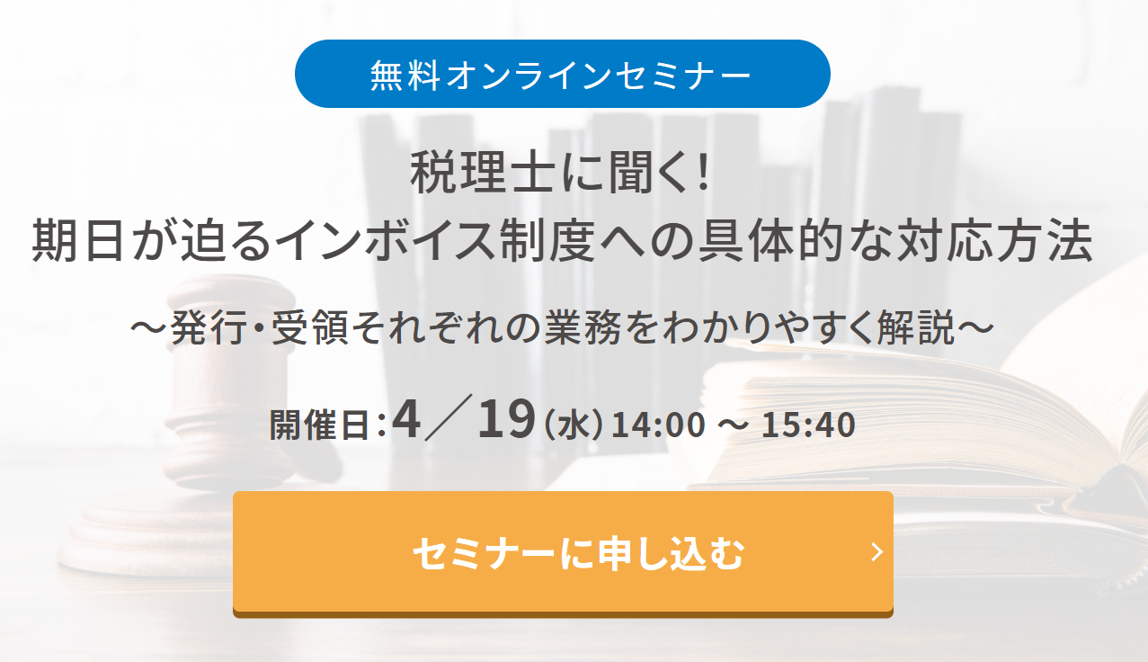 | 対象 | ✔請求書発行のインボイス対応について知りたい方 ✔請求書の受領準備について知りたい方 ✔インボイス制度の開始による請求業務への影響について知りたい方 |