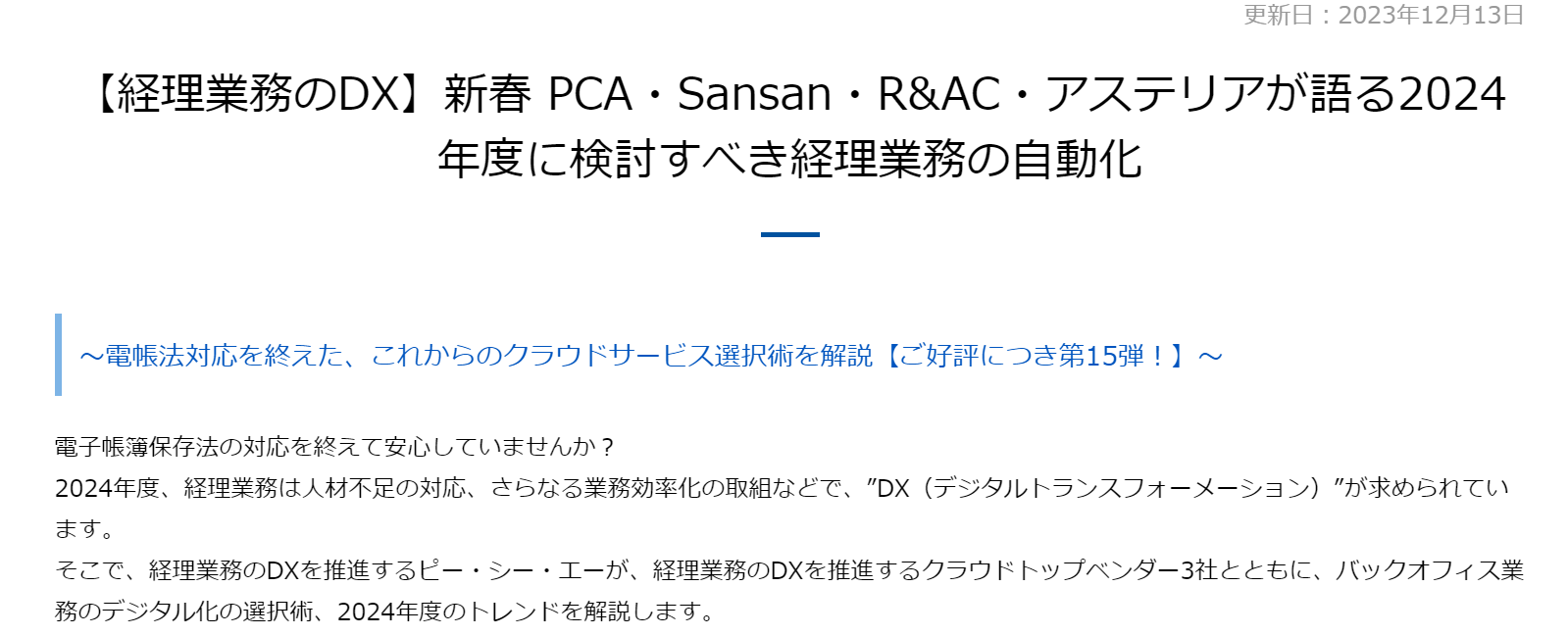 ①【経理業務のDX】新春 PCA・Sansan・R&AC・アステリアが語る2024年度に検討すべき経理業務の自動化 【ピー・シー・エー株式会社】