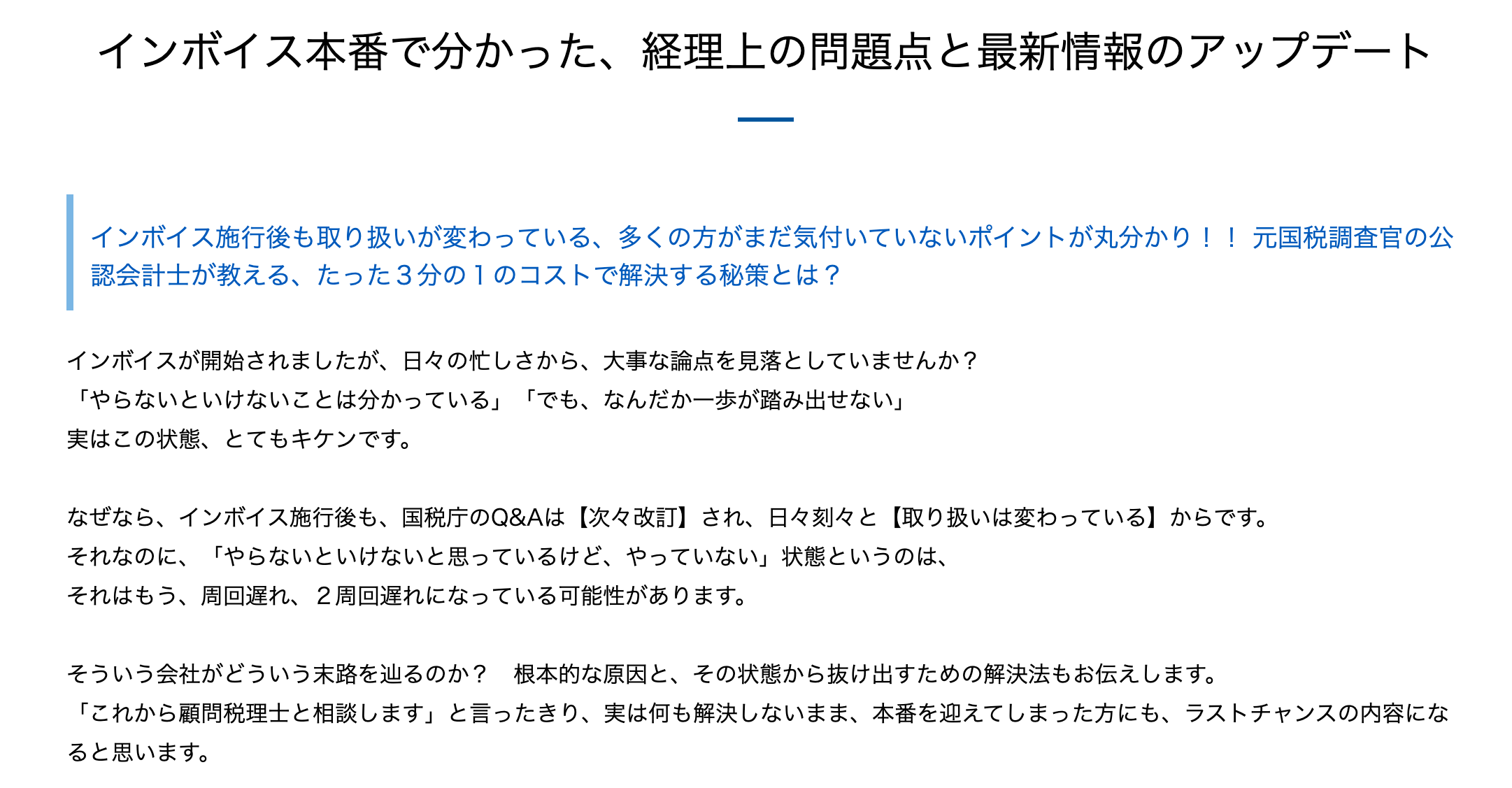 | 対象 | ✔インボイス制度施行後の国税庁のQ&Aの改訂事項をチェックできていない方 ✔日々忙しく、インボイス制度の改訂事項に対応できていない方 |