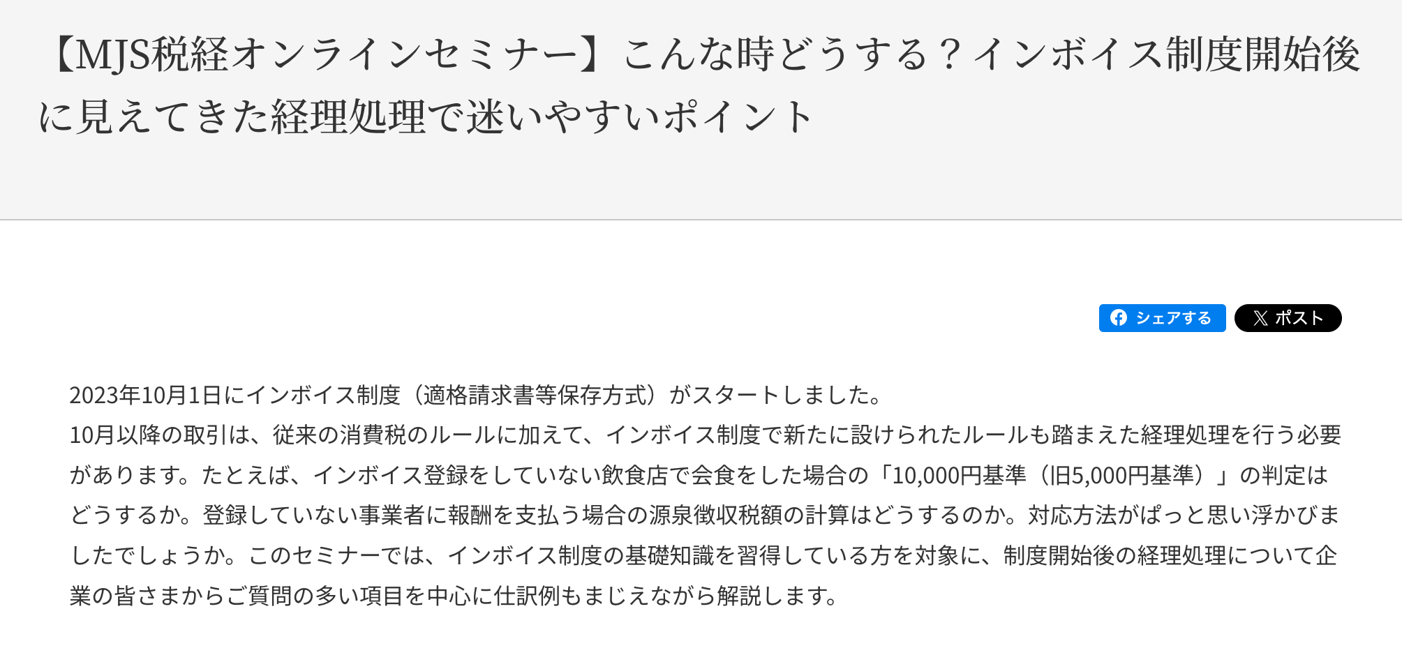 ③【MJS税経オンラインセミナー】こんな時どうする?インボイス制度開始後に見えてきた経理処理で迷いやすいポイント【株式会社ミロク情報サービス 税経システム研究所】