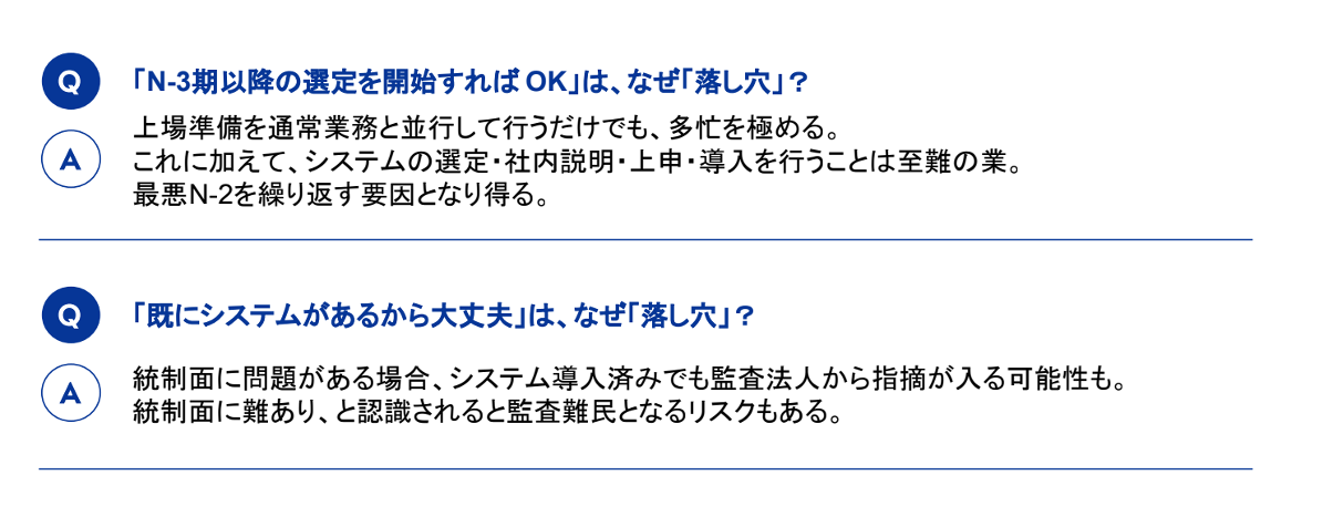 株式会社オロ 吉井(以下、吉井):はじめに、システム選定に関わる落とし穴を解説します。担当者がよくはまってしまう落とし穴は主に2つです。1つ目は「上場準備におけるシステム選定は、N-3期以降に指摘事項に対応しながら開始すれば問題ないと思っていた」というもの、2つ目に「既に実務で使っていて現場に馴染んでいるシステムがあるので、そのあたりは考えなくても大丈夫だと思っていた」というものです。