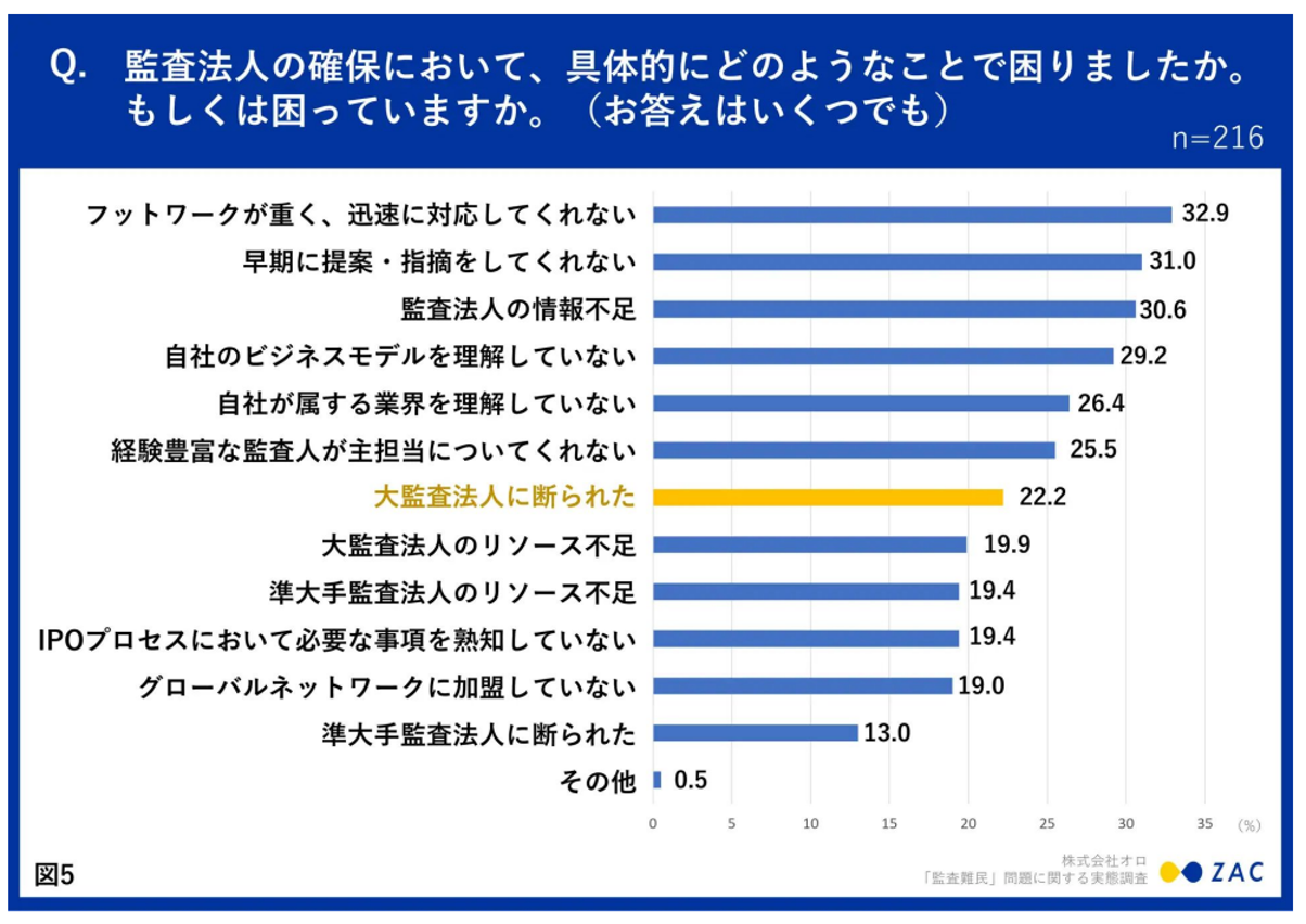 また、監査法人の確保について困ったかというアンケートには、43.2%が「困った」と回答。さらに「大手監査法人に断られた」と回答した企業は回答者の22%にもなり、あらかじめ統制を構築したうえで上場準備に臨むことが重要だとわかります。