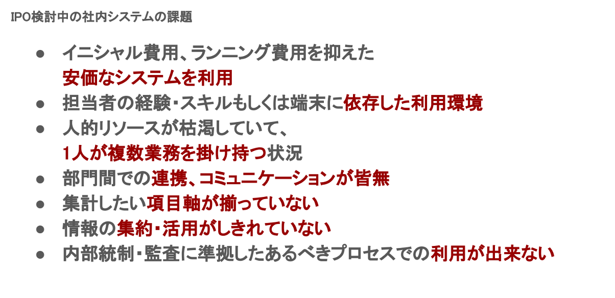 長谷:該当スライドは弊社のお客様からよく聞く課題をまとめたものですが、特に水色部分は上場前後で共通しています。