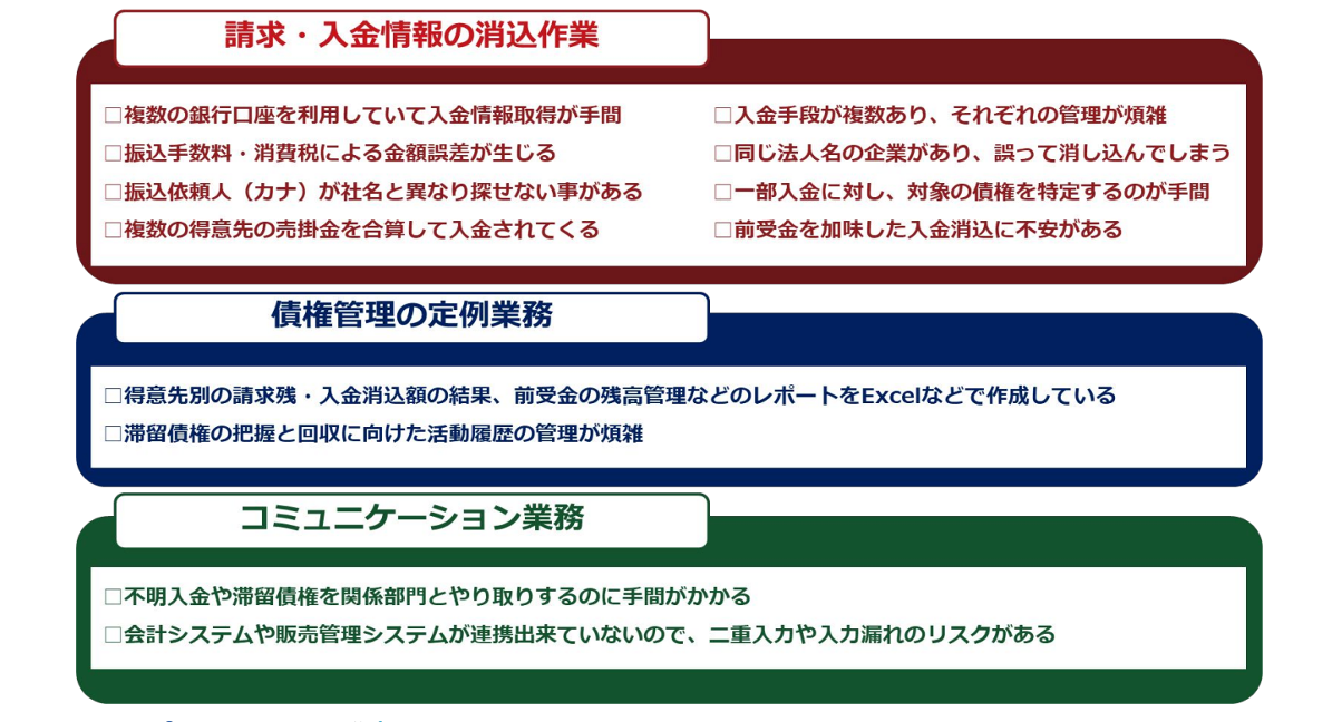 リアルな話をすると、商慣習上で複数の得意先分が合算されて入金されたり、請求満額の入金ではなく、納品や検収などの都合で部分的に入金されたり、様々な商慣習に合わせて入金状況を把握することが必要ですよね。回収状況がタイムリーに捉えられるかという点は、システム選定の指針とも言えます。