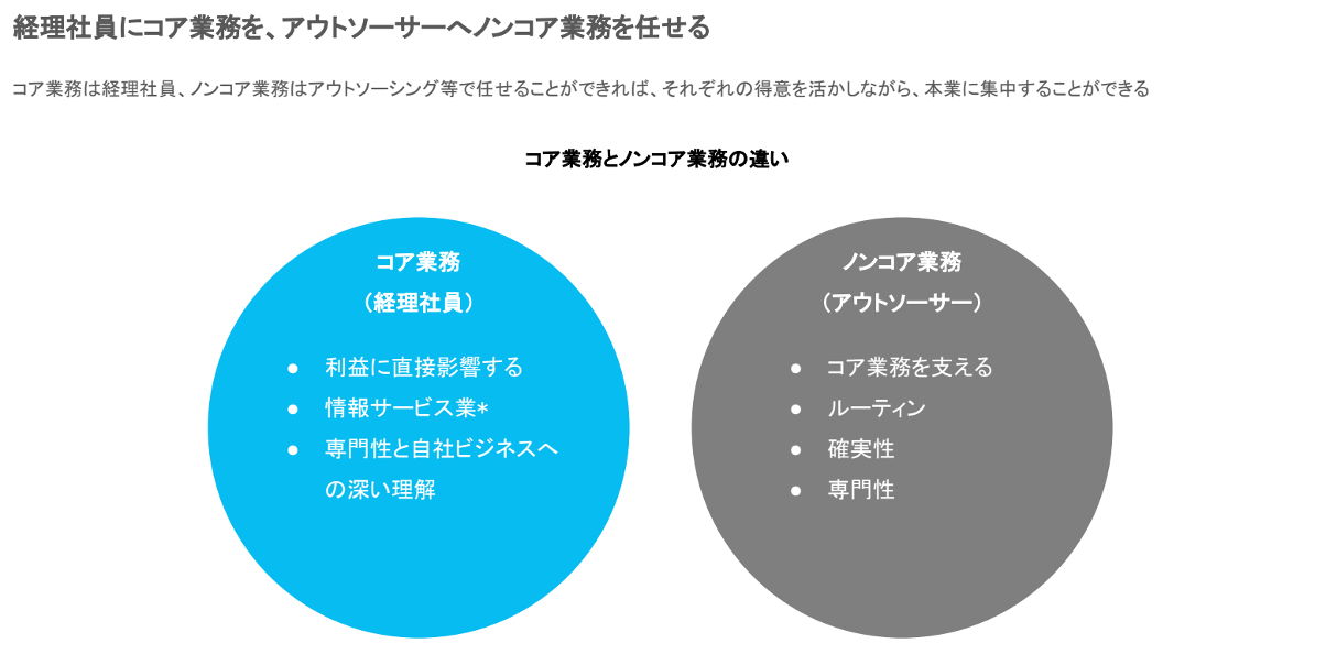 長谷:ではどのように役割分担していくのか。端的に、経理社員にはコア業務を、アウトソーサーにはノンコア業務を任せる形が理想です。一般的に、コア業務は「利益に直接影響する業務」、ノンコア業務は「コア業務を支える業務」と言われています。
