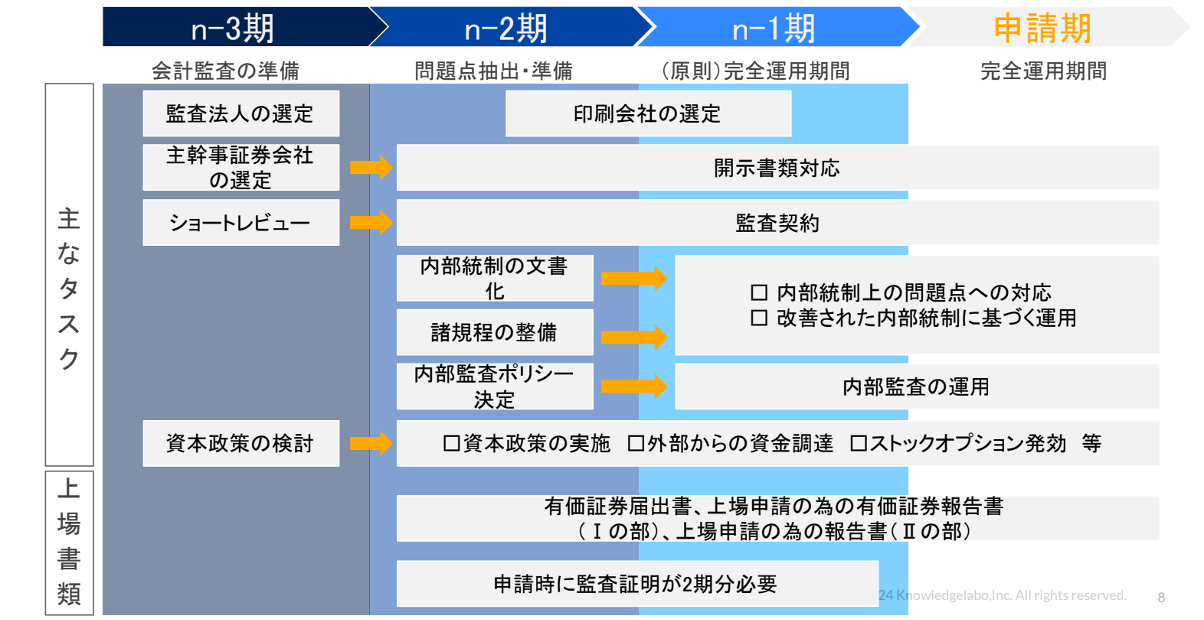 門出:N-3期でやるべきことに注目してください。本格的な上場準備が始まるのはN-2期ですが、監査法人や主幹事証券会社の選定、ショートレビューなどはN-3期のうちに完了しておく必要があります。監査受嘱のハードルが高まっていることを背景に、昨今ではN-3期の位置づけが非常に重要になってきていると言われています。