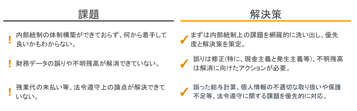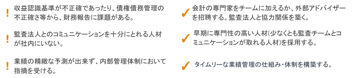 他にも、不明残高の解消や法令遵守はどの企業にも共通する課題です。上場を目指すフェーズの企業では財務責任者の入れ替わりが激しいケースも少なくありませんが、誤りや不明点はN-3期の段階で解消しておきましょう。