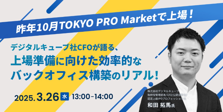 | 対象 | ✔上場を目指しているスタートアップや中小企業の経営者やCFOの方 ✔上場準備の具体的なプロセスや課題解決策を知りたい方 ✔効率的なバックオフィスや内部統制の構築方法に興味がある方 ✔東京証券取引所TOKYO PRO Marketでの上場に関心がある方 |