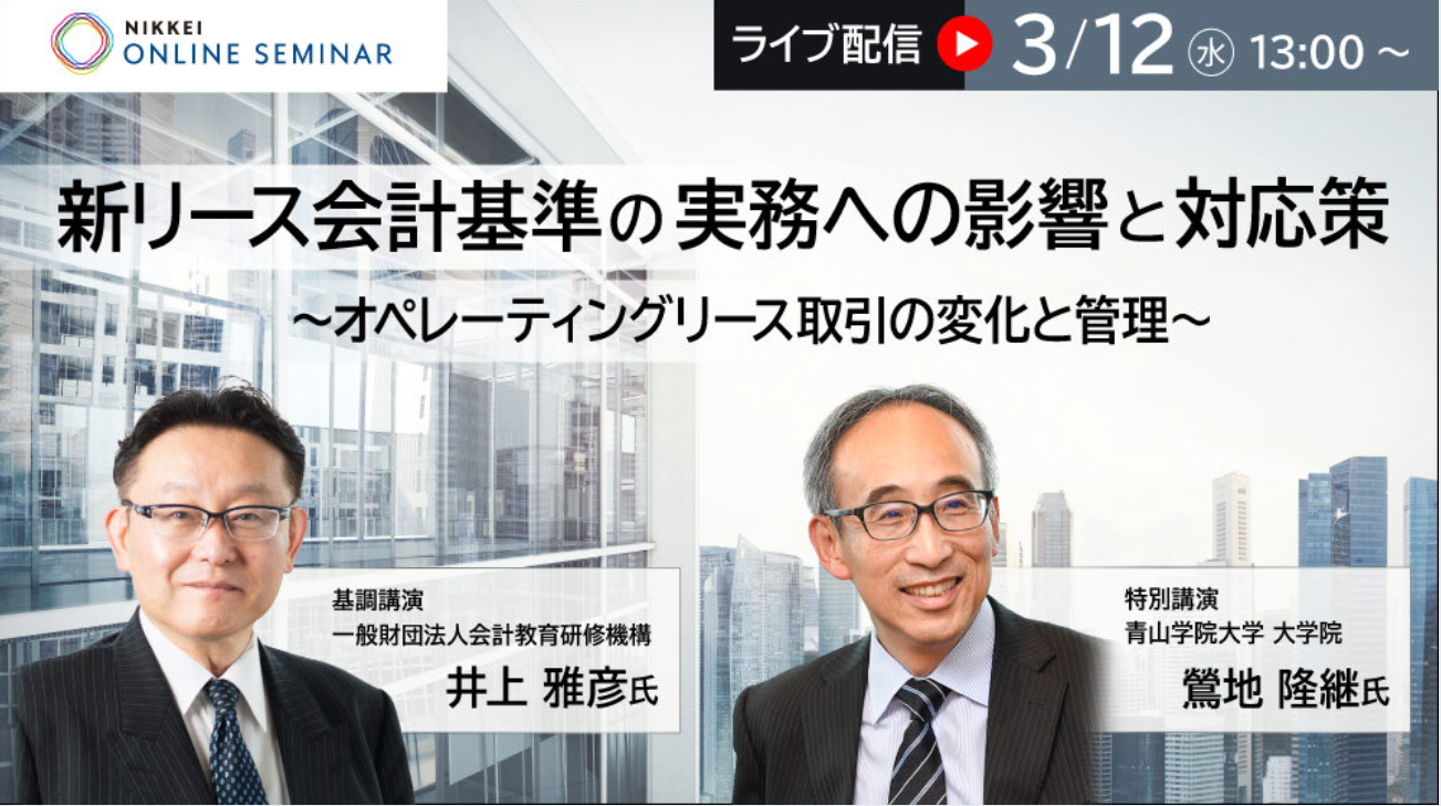 | 対象 | ✔新リース会計基準の理解を深めたい方 ✔実務への具体的な影響、リース管理の効率化、財務の最適化に向けた戦略について学びたい方 |