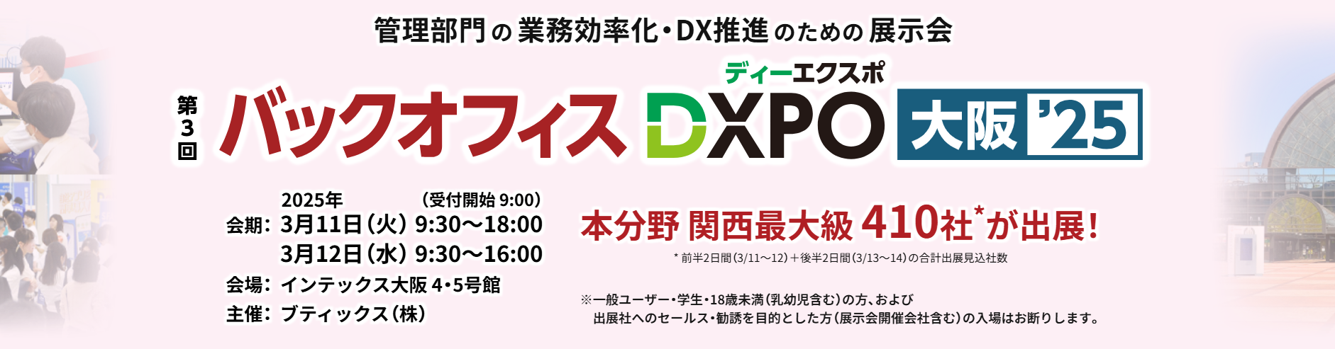 | 対象 | ✔バックオフィス部門の最新の製品やサービスを比較検討したい方 ✔その場で出展製品・サービスを体験してみたい方 |