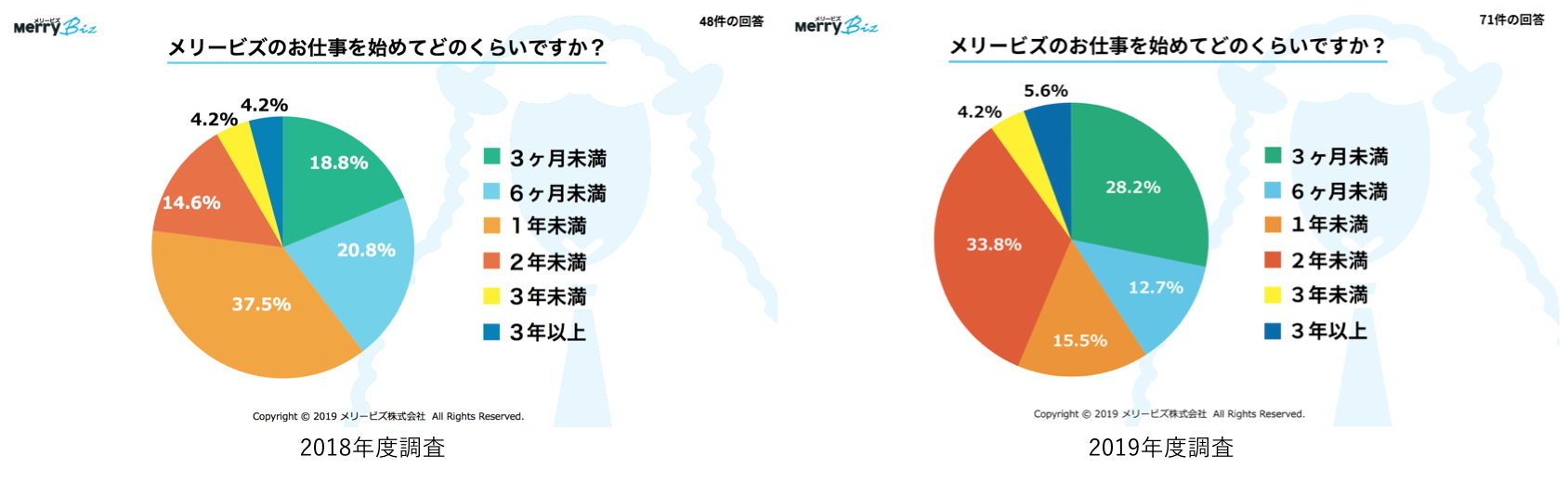 加えて、メリービズでの経験が年数が1年以上のスタッフが、回答者の43%以上、2年以上のスタッフが10%を占めました。「バーチャル経理アシスタント」のサービス展開が本格化したのが2年前の2017年9月であり、定着率の良さが伺えます。3年以上のスタッフは2倍、3年未満も1.5倍になっています。(一部スタッフはそれ以前からメリービズでお仕事を開始)