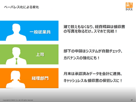 | 中森: コロナ禍でもテレワークが出来なかった理由として、「郵便物への対応」「紙の処理」「押印」といった理由がよく挙げられます。出社理由を減らすには、ペーパーレス化が大きな鍵となります。ラクスでは、管理職以外は完全テレワークを実現しています。これは自社サービスである『楽楽精算』を活用した成果であり、経費精算に関わる全てのステークホルダーにとってメリットを生み出すことができました。 |