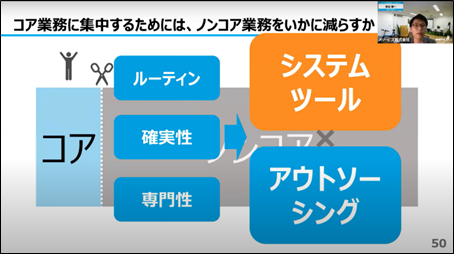 ノンコア業務にかける時間を減らすために、自社に合ったシステムやツールを活用しながら、ツールで解決できない部分はアウトソーシングで解決していく、ツールとアウトソーシングの掛け合わせこそ「コア業務への集中」を実現するために真に意識すべきポイントであると言えます。
