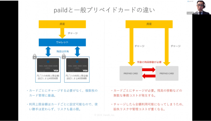 Handiiセールスディレクターの山村漠氏は、クラウド型法人カードサービス「paid」を紹介。特定のSaaSの支払い停止などの特徴的な機能をあげ、一般のプリペイドカードと違って残高が共有できるため複数枚あってもカード管理がしやすく、発行手数料・年会費無料、会計ソフトとも自動連携できる点などを説明しました。
