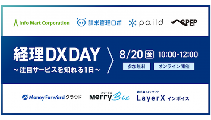 2021年8月20日に開催された経理・財務業務のデジタル化・リモート化を促進する注目サービスを紹介する無料オンラインイベント「経理DX DAY」(株式会社LayerX主催)では、株式会社マネーフォーワード、株式会社ROBOT PAYMENT、メリービズなど7社が登壇。経理DXが注目を集めている背景やそれぞれのサービス内容について紹介しました。この記事では本イベントをレポートします。