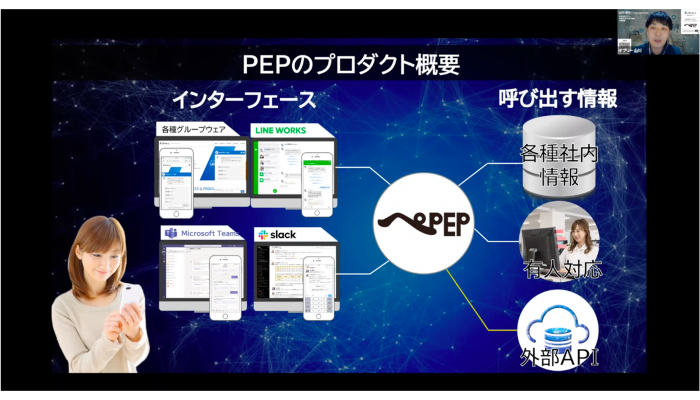 ギブリー取締役の山川雄志氏は、社内からの問い合わせ対応に時間がかることに悩む企業が多いと説明。AIチャットボット「PEP」の設置によりAIが自動応対をし、問い合わせる側も問い合わせを受ける側も工数削減ができるとしました。また比較的短期間で効果が得られることなどから経理DXに向いていると説明しました。