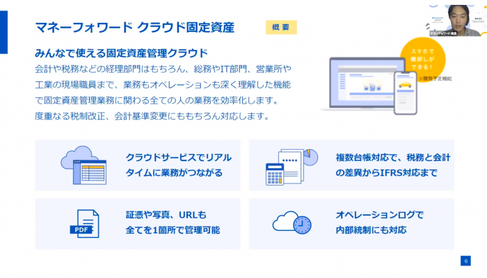 マネーフォワード経理財務ERP本部副本部長の峰島侑也氏は新サービスとして、複数部署が関わることが多い固定資産を管理しやすくする「マネーフォワードクラウド固定資産」と、売上計上、消込、債権確認まで債権処理フローを一元管理しできる「マネーフォワードクラウド債権請求」を紹介しました。