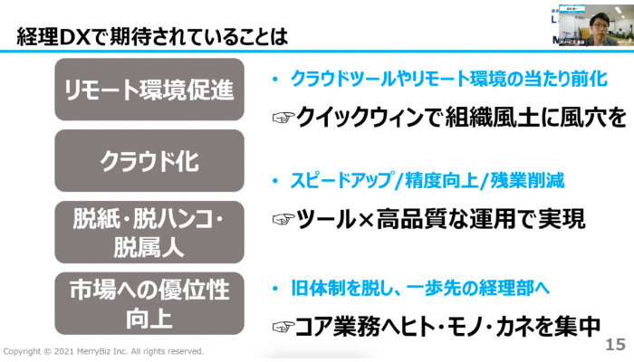 まず経理DXにどのような期待が寄せられているかという点について、顧客の声などから「リモート環境促進」「クラウド化」「脱紙・脱ハンコ・脱属人」「市場の優位性の向上」の4つを提示。具体的には、「リモート環境の促進」によりクラウドツールやリモートワークの当たり前化、「クラウド化」や「脱紙・脱ハンコ・脱属人」によりスピードアップや精度向上、残業削減、「市場の優位性の向上」により旧体制からの脱却を目指しているケースが多いと解説しました。