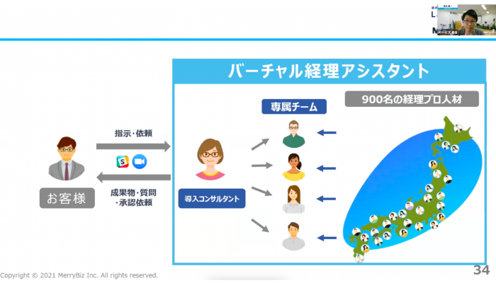 メリービズからはビジネスディベロップメントチーム コンサルタントの長谷龍一が登壇。「経理DX・クラウド化を促進し業務負担ゼロへ オンラインアウトソーシングの『バーチャル経理アシスタント』」をテーマにお話をいたしました。