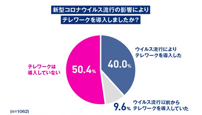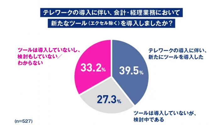 LayerX社が経理・財務担当者を対象に行った実態調査*¹ によると、40.0%が「ウイルス流行によりテレワークを導入した」、9.6%が「流行前から導入していた」と回答。全体の約半数がすでにテレワーク導入済みとわかりました。またテレワークのために66.8%が会計・経理業務において「新たなツールを導入」または「導入を検討中」と回答。経理DXへの関心の高さがうかがえました。