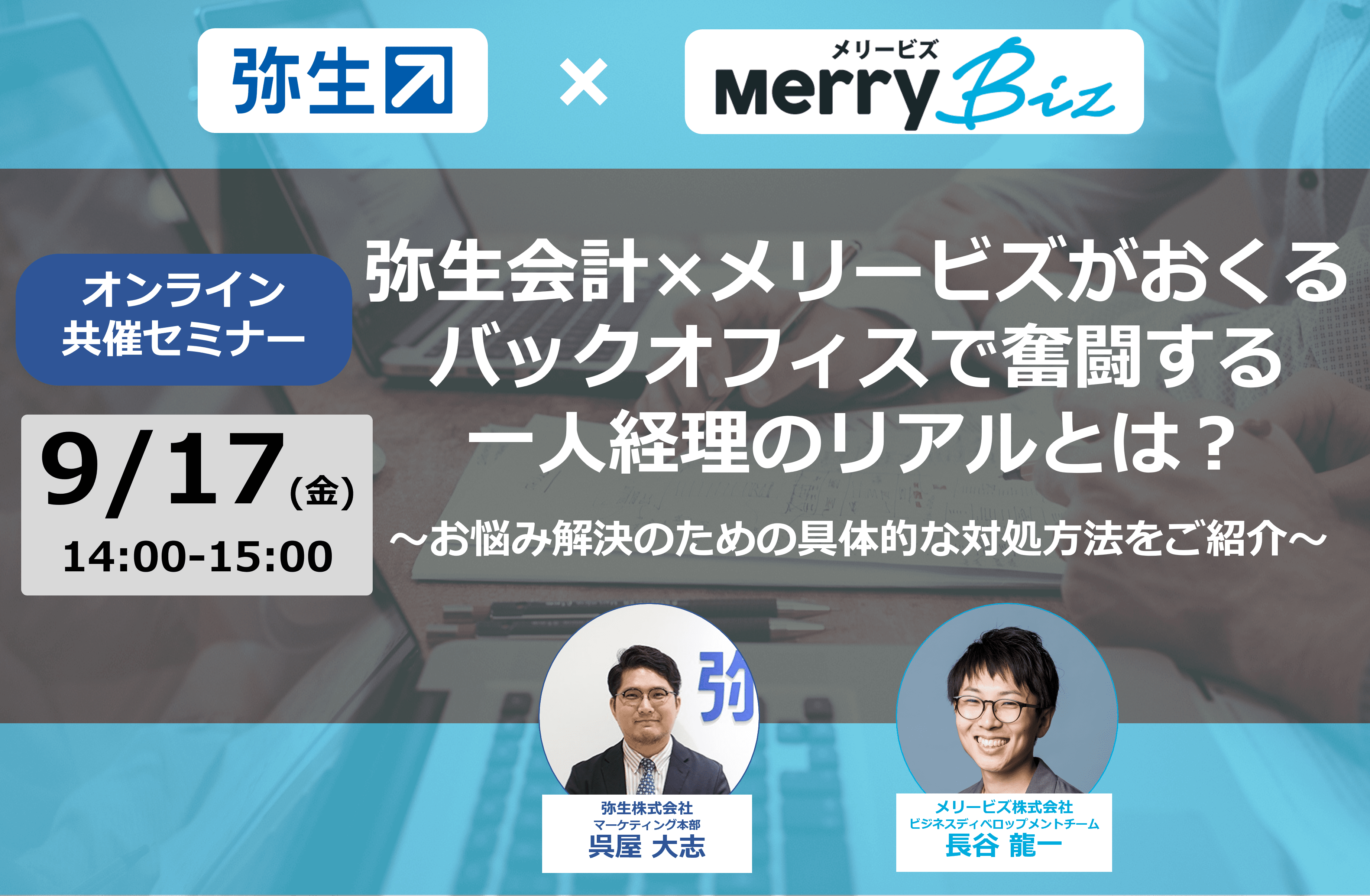 そこで、一人経理の方にも多く利用されているサービスを提供する弥生とメリービズが、それぞれの強みを活かしたセミナーを開催することで、より多くの一人経理で悩む方を救えるのではないか……との期待から、本セミナーの共同開催に至りました。