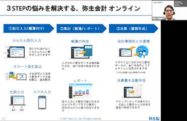 | 数ある弥生シリーズの中で、今回の共催セミナーで紹介した『弥生会計 オンライン』は、中小企業やスタートアップ企業、起業・開業したばかりの方に向けた会計ソフト。まさに、今回のテーマである「一人経理」の業務を効率化する上で最適なツールといえます。 | ||