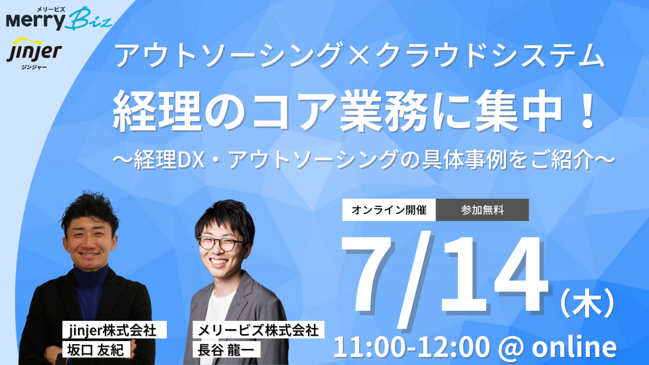 バックオフィス効率化のためのクラウドサービスを提供するjinjer社と、オンライン経理アウトソーシングを中心にバックオフィスの課題解決を支援するメリービズ。本セミナーは、それぞれの立場から語られる、経理ご担当者必見の内容となっています。