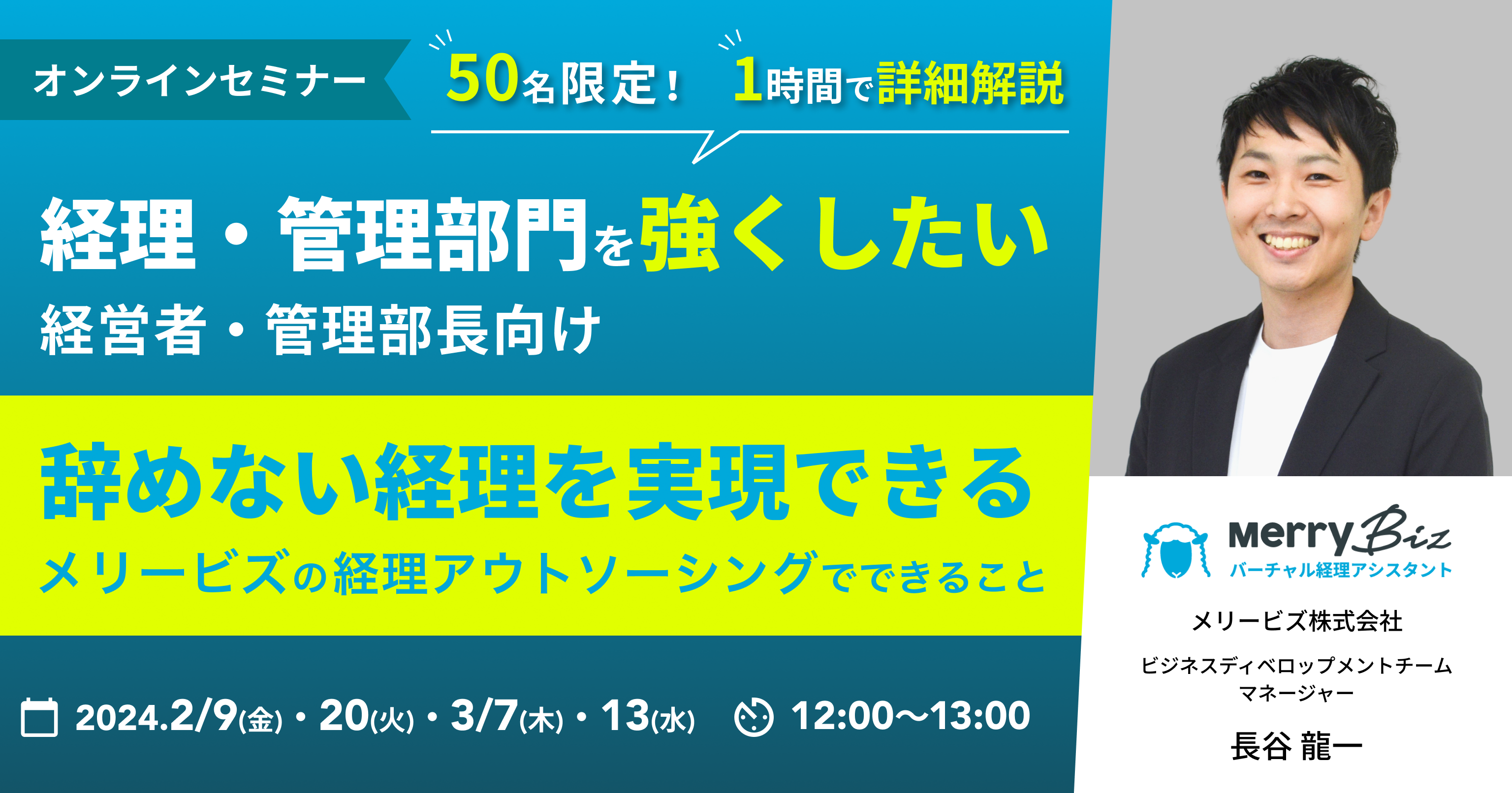 本セミナーでは、経理社員の退職に揺らがない体制構築のためのポイントと、そういった課題の有効打になるメリービズの経理アウトソーシング『バーチャル経理アシスタント』についてご紹介します。採用とは異なるアウトソーシングの特徴やメリット、社員とアウトソーシングのハイブリッドによる生産性の向上手法等を解説。