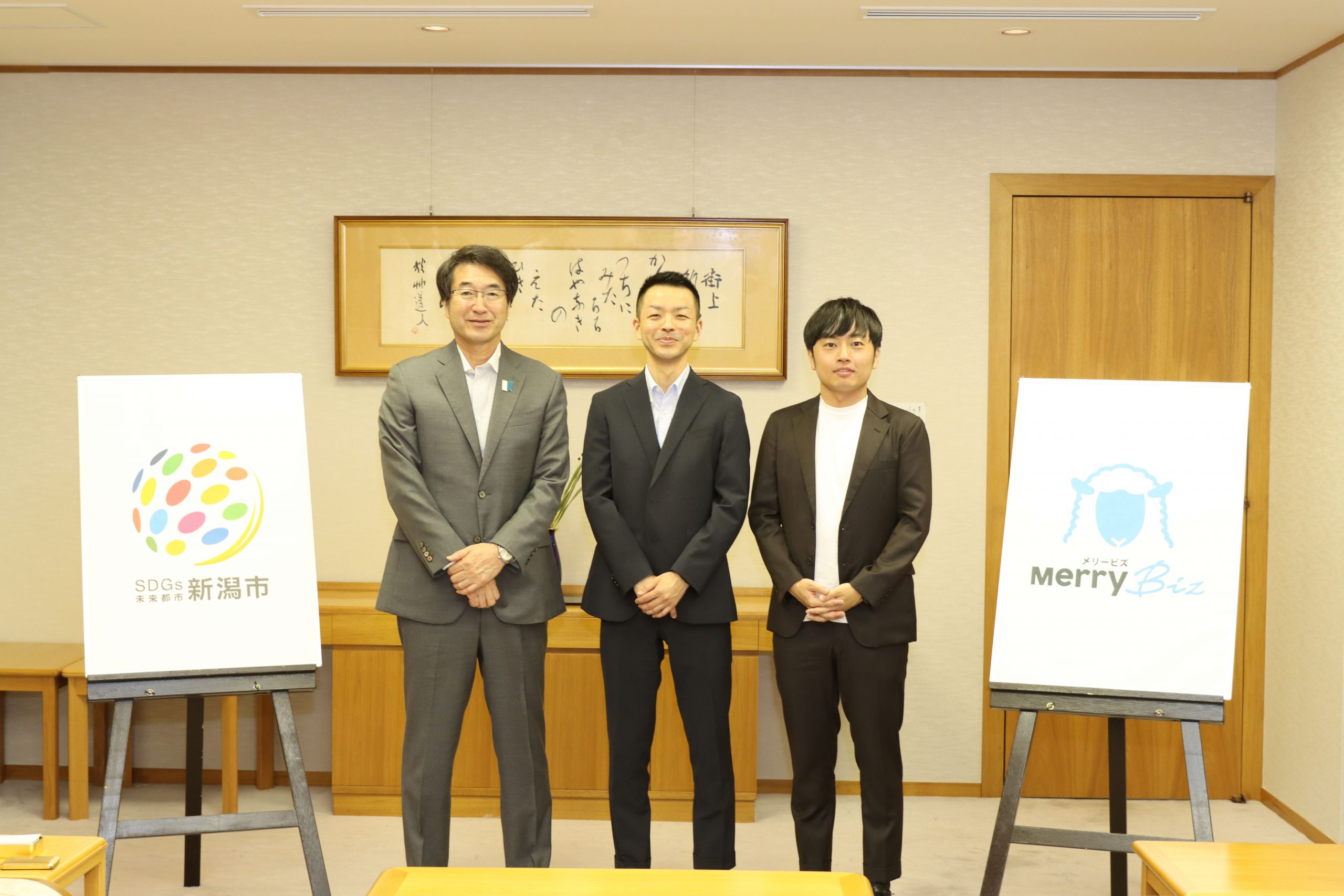 写真左:中原八一 新潟市長 中央:メリービズ株式会社 菊地真吾 右:メリービズ株式会社 山室佑太郎