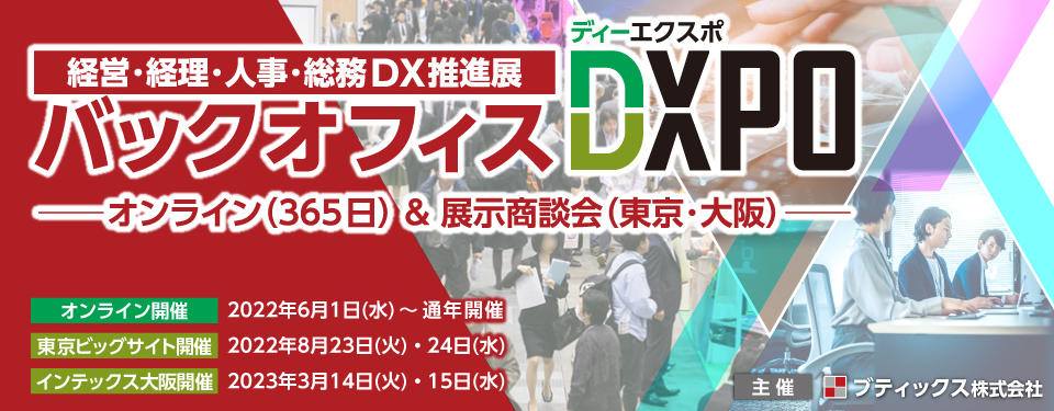 「バックオフィスDXPO 東京 ’22 」は、「オフィスDX展」「経営・総務DX展」「経理・財務DX展」「人事・労務DX展」「RPA・業務自動化展」の5つの展示会から構成されるオフラインイベントです。