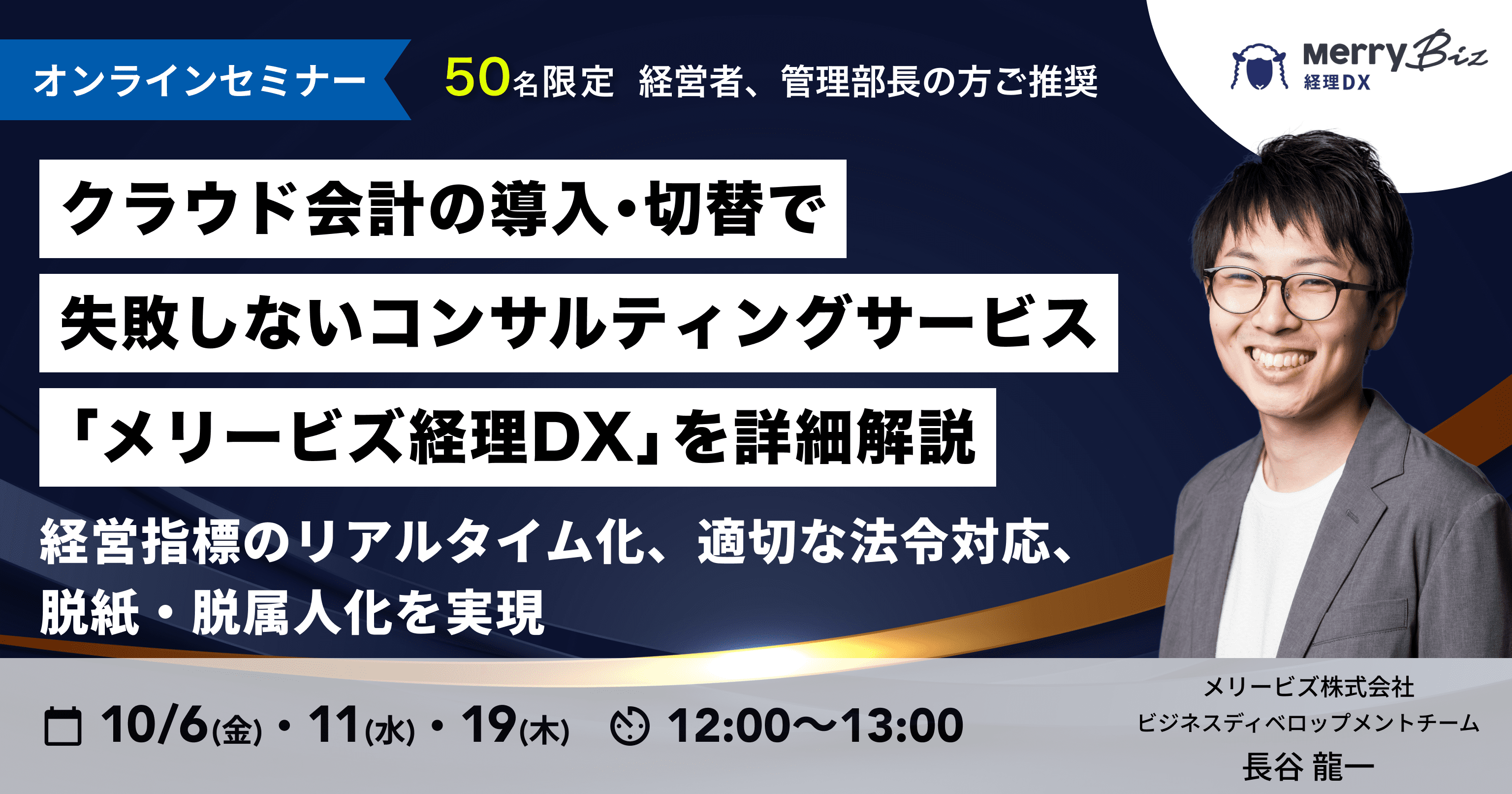 本セミナーでは、お客様にマッチしたシステム選定および導入支援、並びにシステム間の連携のコンサルティングも行う『メリービズ経理DX』についてご紹介します。